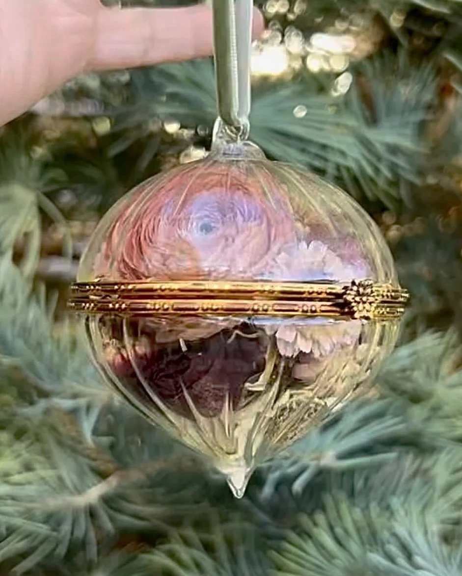 One flower, or a small sampling of flowers, in a pressed glass ornament.