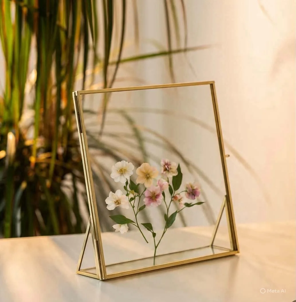 Five to seven flowers and a small sampling of greenery preserved petal by petal, reconstructed, and arranged in an 8 by 12 hand-crafted glass metal tray.