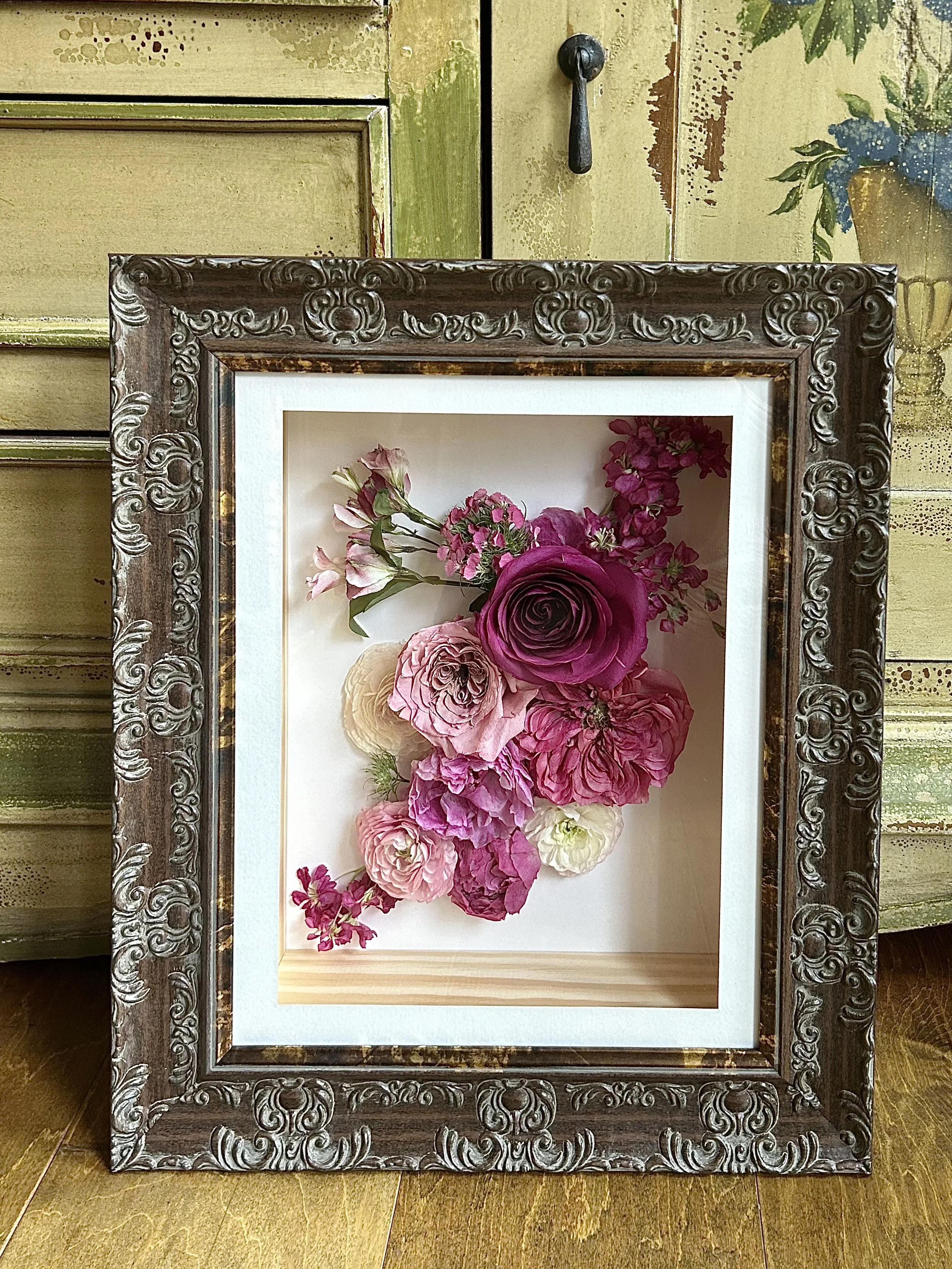 This design is recommended mainly for smaller frames, trays, or projects for the purpose of gifting, as it is simple and universal. This style takes a mixture of whole flowers and petals to create a dispersed look across the face of the surface. or mini-frames and trays purchased as add-ons.