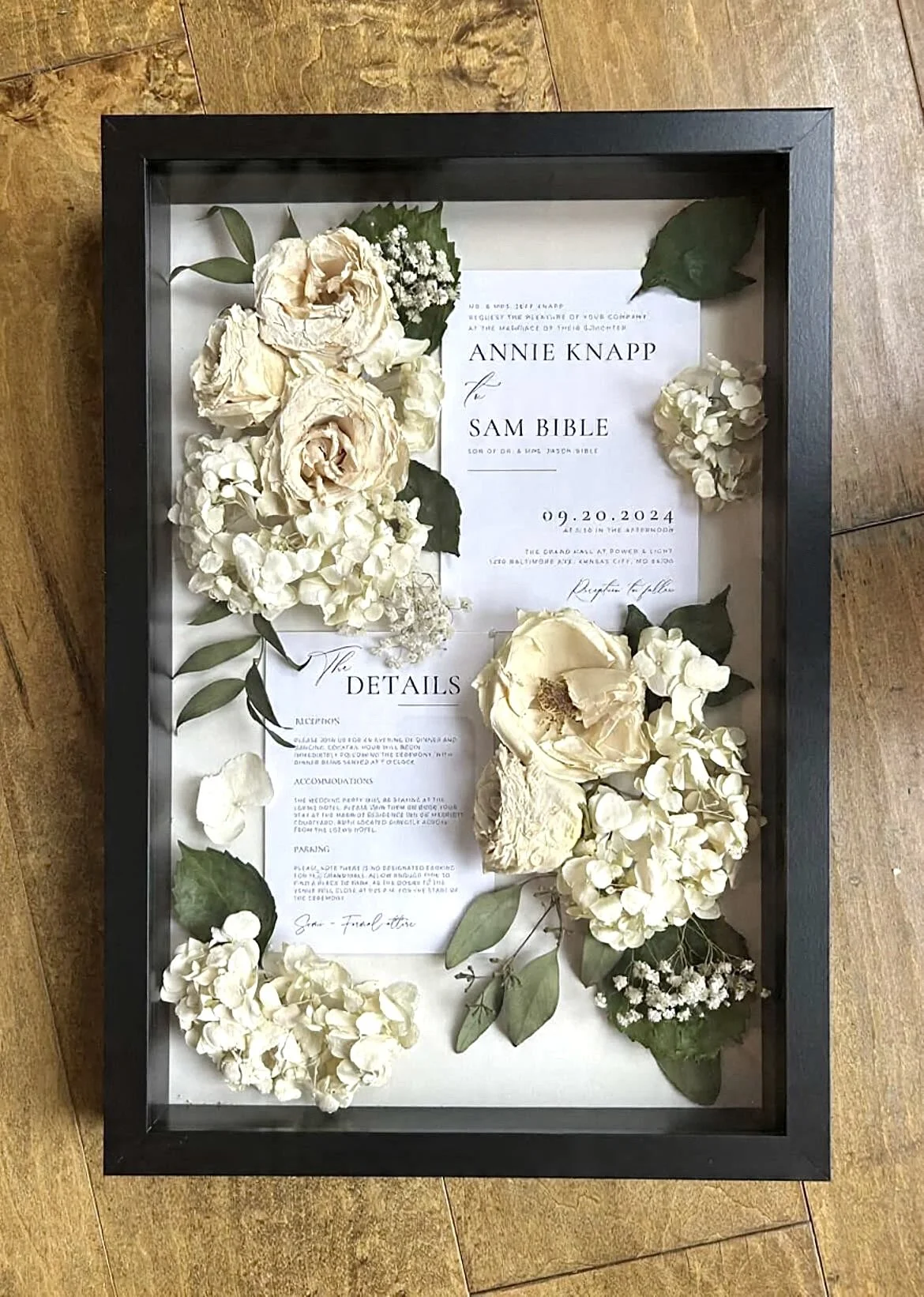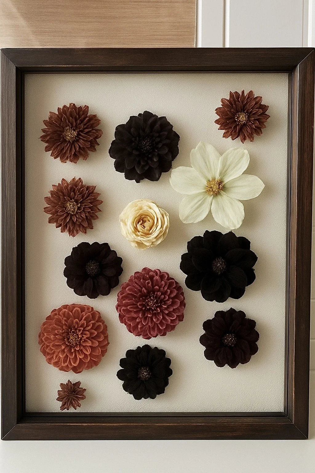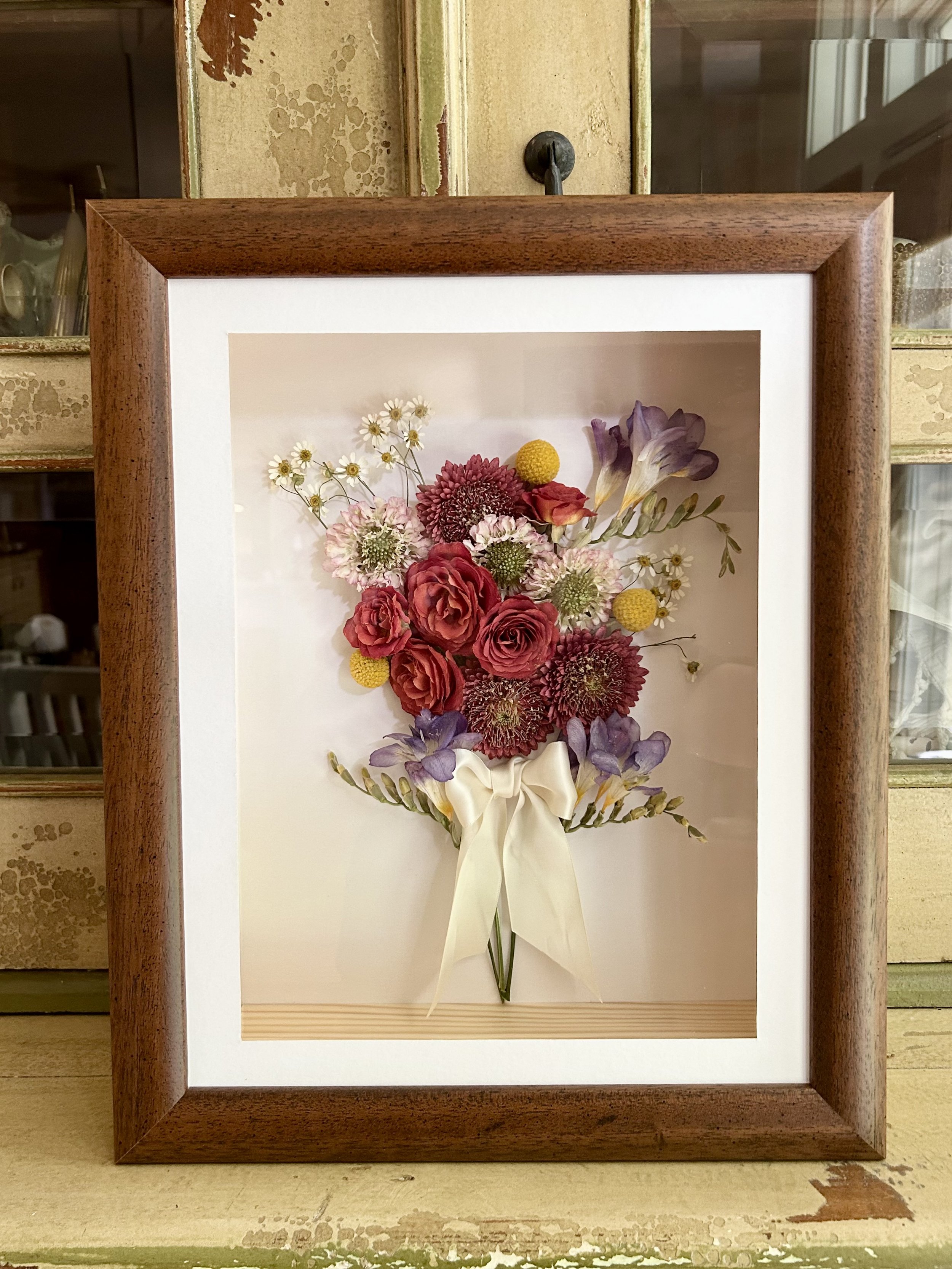 This design is recommended mainly for smaller frames or projects for the purpose of gifting, as it is simple and universal. This style takes a mixture of whole flowers and petals to create a dispersed look across the face of the surface.